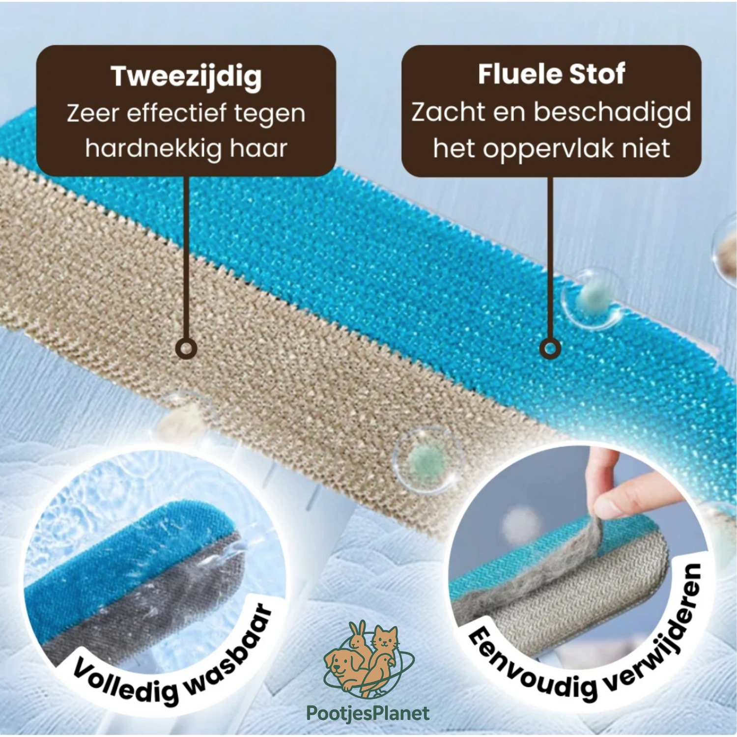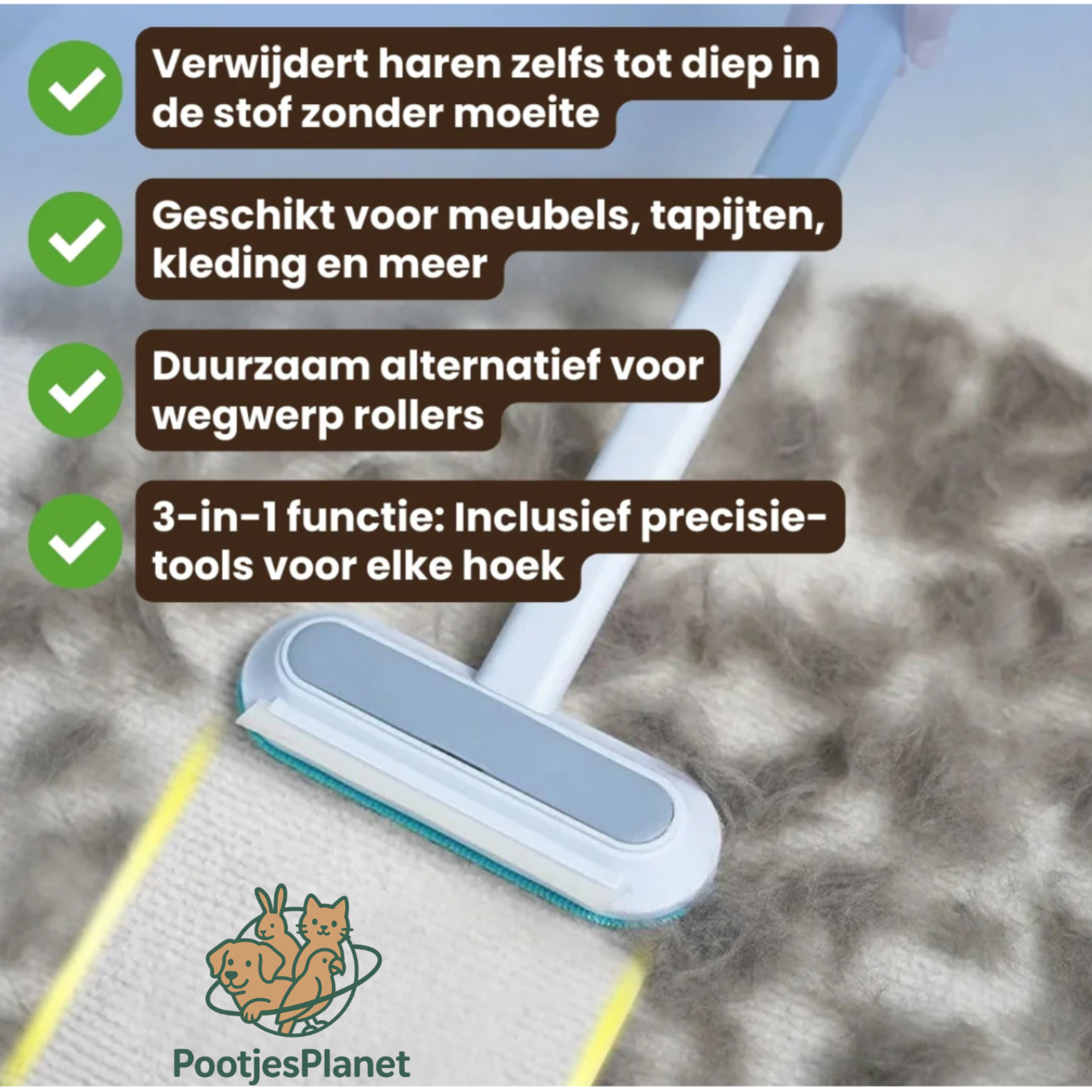 PetWipe Pro™ is jouw slimme schoonmaakhulp die meer doet dan enkel vegen, hij pakt haren vast met statische grip, glijdt moeiteloos over elk oppervlak en laat geen pluis, krassen of gedoe achter.