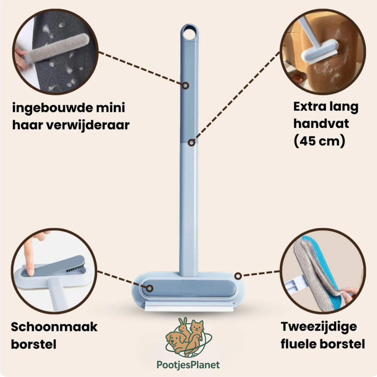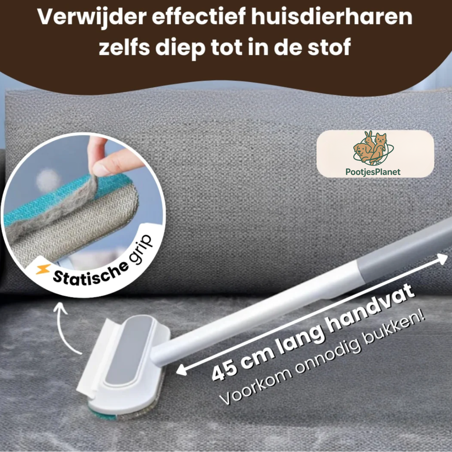 Beweeg de borstel simpelweg met een heen-en-weer beweging over het oppervlak. Door de elektrostatische werking trekt het haar zich als een magneet aan. De haartjes laten zich daarna makkelijk verwijderen.