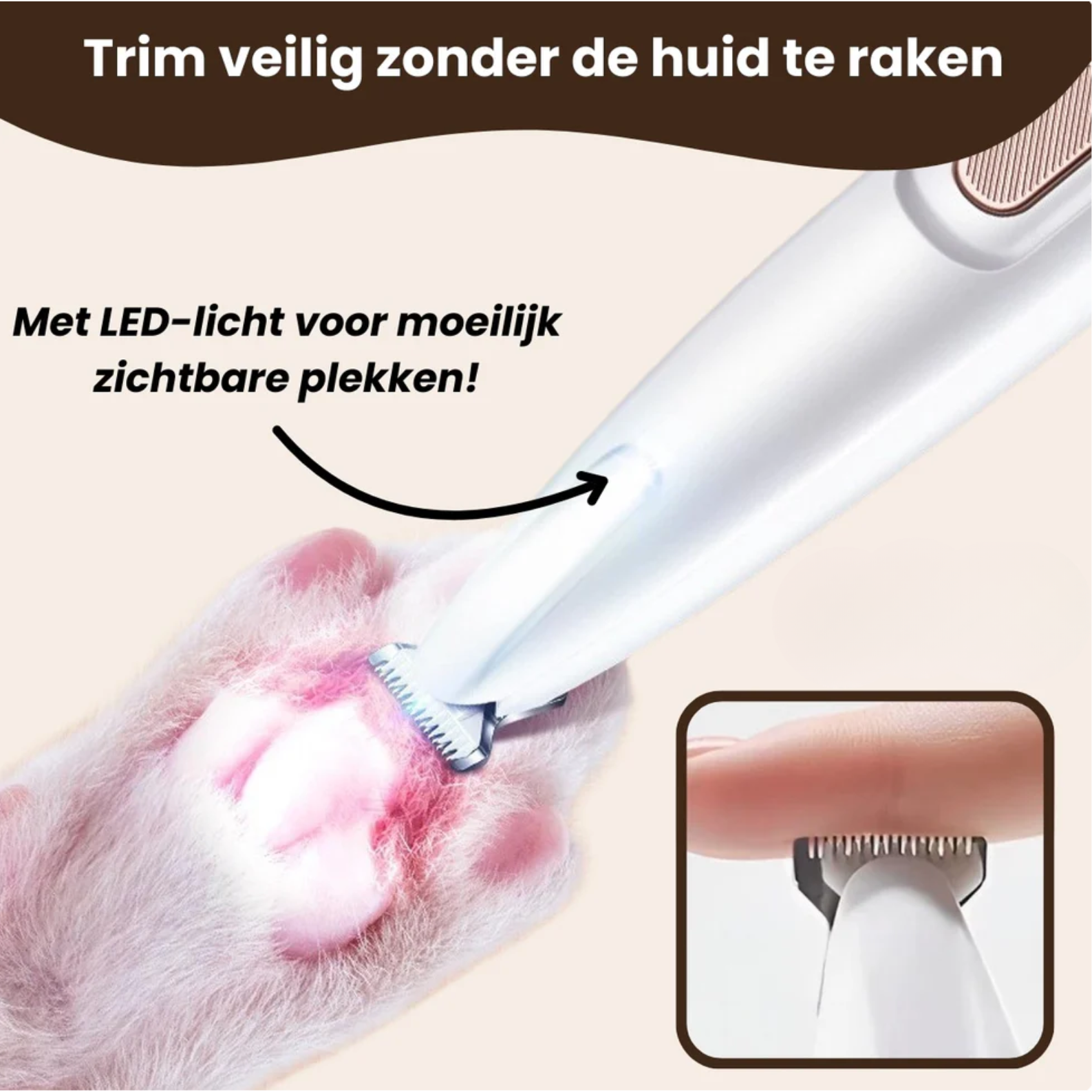 Waar je met gewone trimmers al snel in het donker tast, biedt de PawGlow™ een heldere LED-lamp direct boven het trimgebied. Dit geeft je perfect zicht, zelfs bij dikke of donkere vacht. Zo voorkom je per ongeluk knippen in de huid en werk je tot op de millimeter nauwkeurig – ideaal voor gevoelige plekken zoals tussen de tenen of onder de kin.