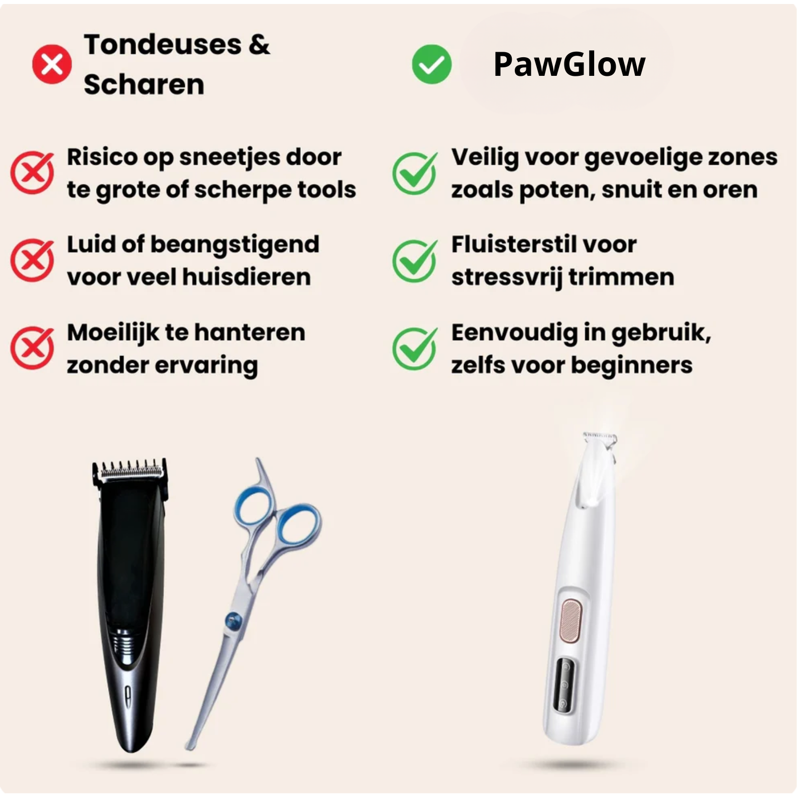 Traditionele trimmers en scharen brengen vaak risico’s met zich mee: snijwonden, stress bij je huisdier en lastig gebruik zonder ervaring. PawGlow™ lost dit op met slimme technologie, veiligheid en gebruiksgemak — ontworpen voor elke huisdierliefhebber, niet alleen professionals.